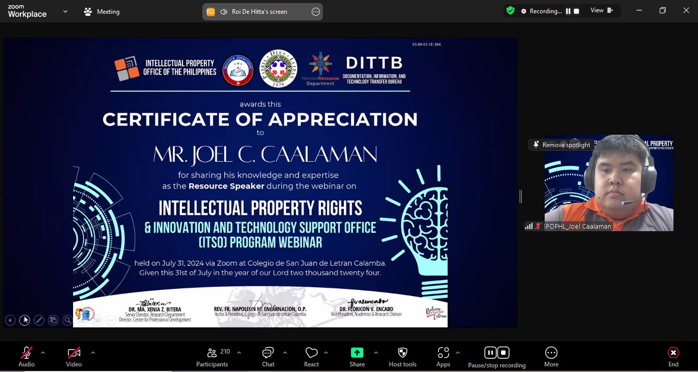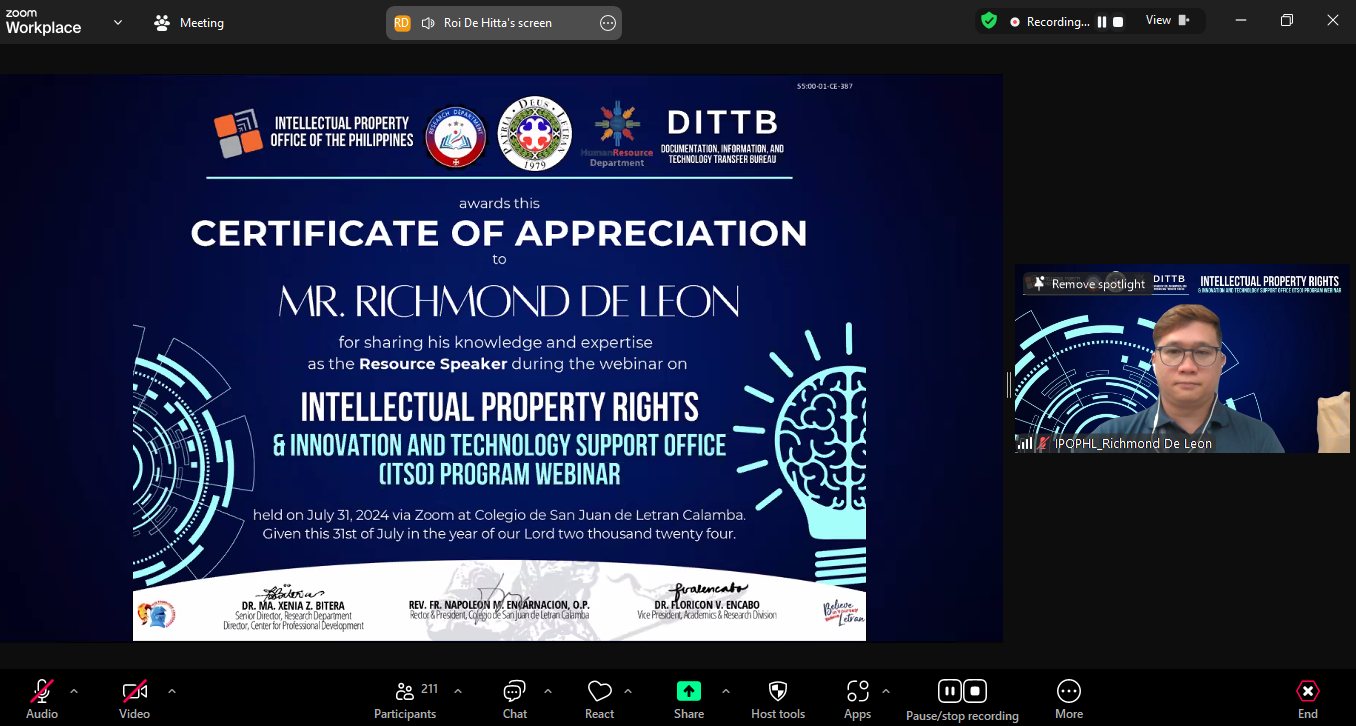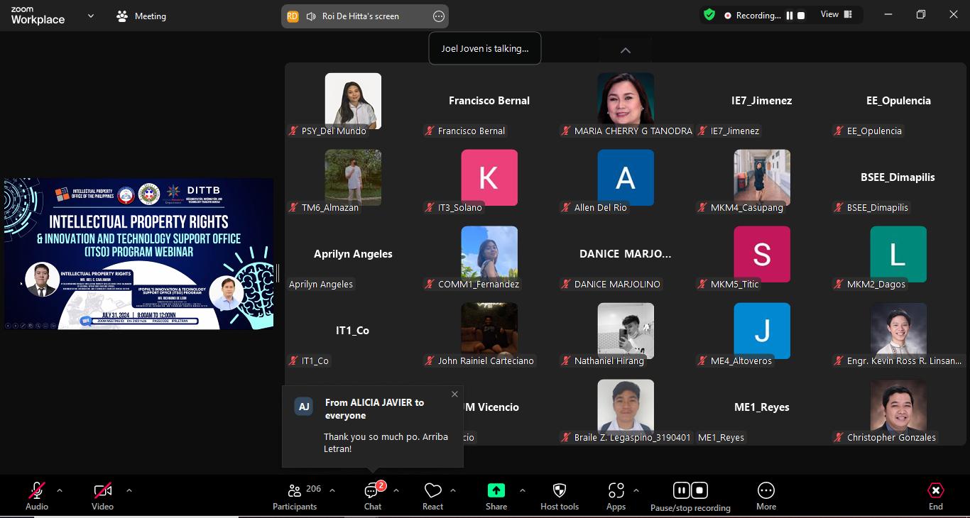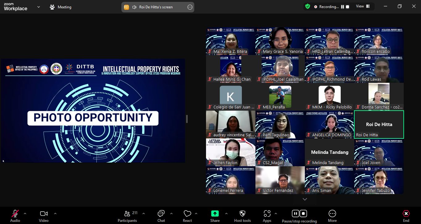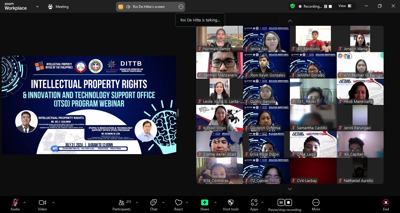 Mr. Joel C. Caalaman, IP Field Operations Specialist, Intellectual Property Satellite Office (IPSO) Calabarzon IP Regional Operations Division (IPROD), and Documentation, Information, and Technology Transfer Bureau (DITTB) and Mr. Richmond de Leon, Administrative Assistant III, IP Management & Technology Transfer Division (IPMTTD) Documentation, Information, and Technology Transfer Bureau (DITTB)are the resource speakers discussing the Intellectual Property and Innovation & technology Support Office (ITSO) Programs respectively. The Webinar was attended by the Administrators, Employees, Faculty, and Students with Research subjects.