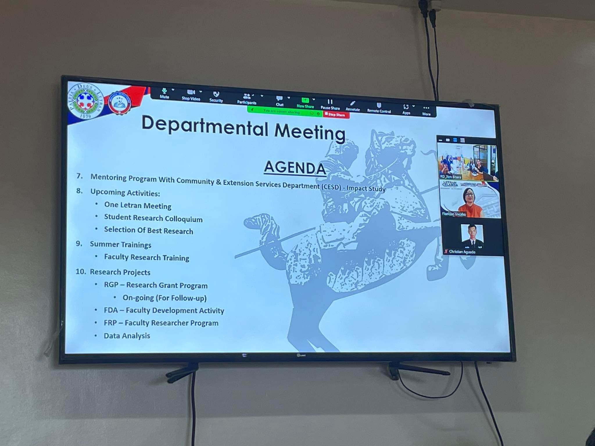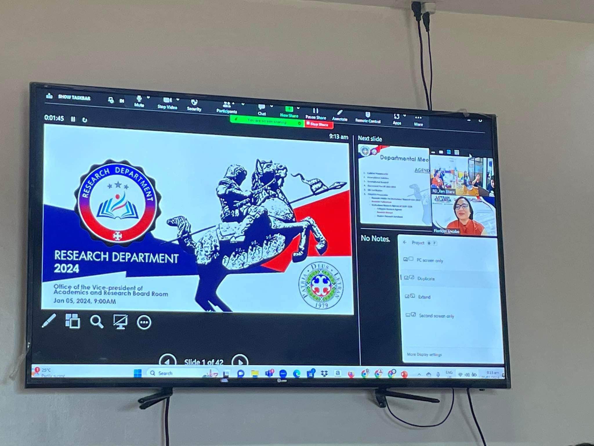 The Research Department, headed by Dr. Ma. Xenia Z. Bitera, had a Departmental Meeting on January 5, 2024, 9am at the OVPAR Boardroom with Dr. Floricon V. Encabo, the Vice President for Academics and Research Division. Accomplishments for the 1st Semester AY2023-2024, important updates, research agenda, upcoming activities, and a collaborative project for the Second Semester, AY 2023-2024 were discussed during the meeting.