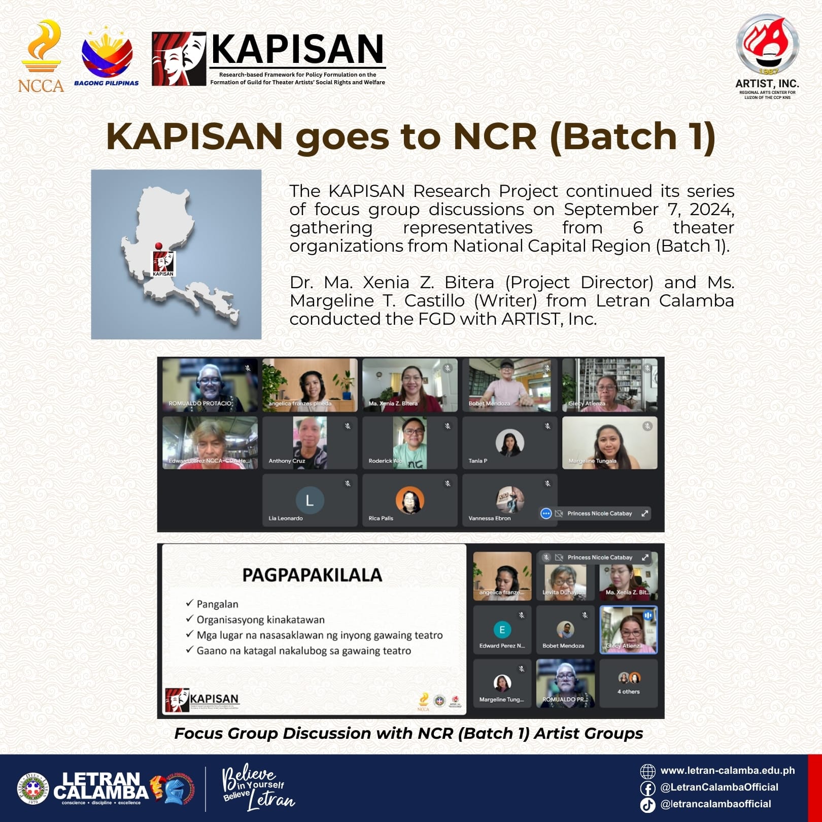 The KAPISAN Research Project continued its series of focus group discussions on September 7 and 9, 2024, gathering representatives from 13 theater organizations from NCR. This collaborative endeavor, funded by the NCCA and executed in partnership with ARTIST, Inc., seeks to establish a research-based policy framework for the welfare of theater artists. Dr. Ma. Xenia Z. Bitera (Project Director), Ms. Margeline T. Castillo (Writer), and Ms. Magnolia R. Quiatchon (Writer) from Letran Calamba conducted the FGD sessions with ARTIST, Inc. Participants from esteemed theater organizations shared valuable insights on their distinct theater group features, practices, and challenges.