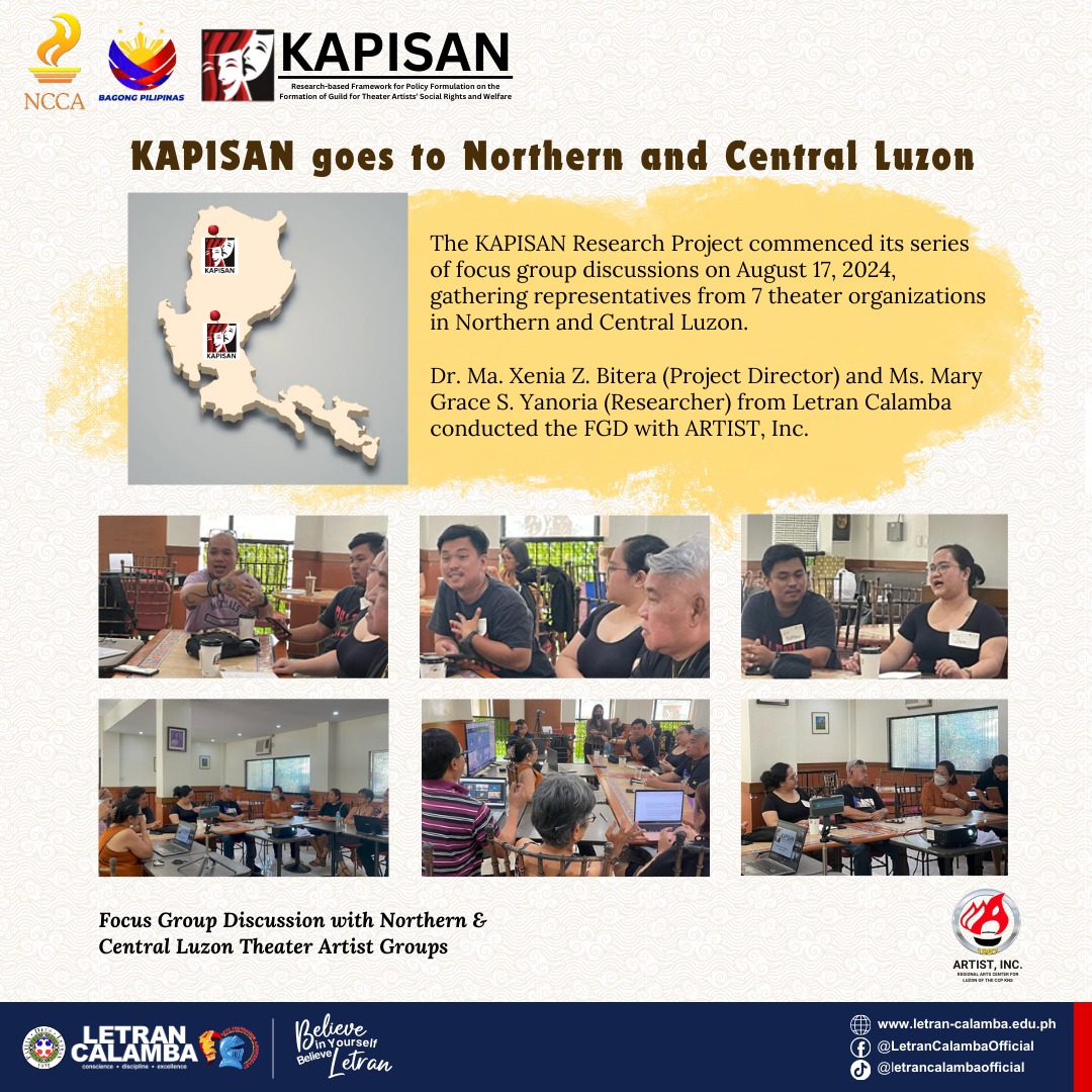 The KAPISAN Research Project commenced its series of focus group discussions on August 17, 2024, gathering representatives from 7 theater organizations in Northern Luzon. This collaborative endeavor, funded by the NCCA and executed in partnership with ARTIST, Inc., seeks to establish a research-based policy framework for the welfare of theater artists. Dr. Ma. Xenia Z. Bitera (Project Director) and Ms. Mary Grace S. Yanoria (Researcher) from Letran Calamba conducted the FGD with ARTIST, Inc. Participants from esteemed theater organizations shared valuable insights on their distinct theater group features, practices, and challenges.