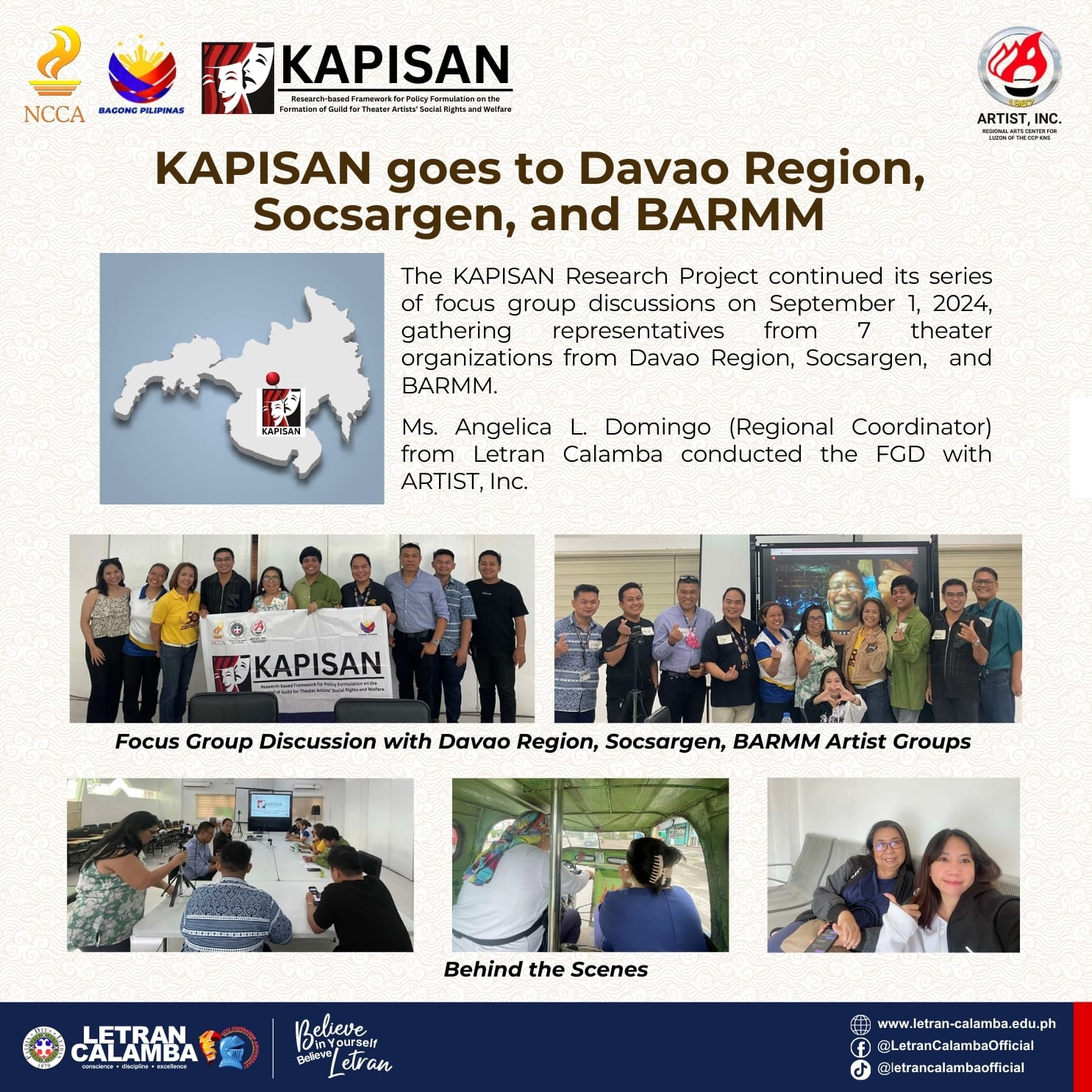 The KAPISAN Research Project continued its series of focus group discussions on August 31-September 1, 2024, gathering representatives from 6 theater organizations from Central Visayas, 8 from Western Visayas, and 7 from Davao Region, Socsargen, and BARMM. This collaborative endeavor, funded by the NCCA and executed in partnership with ARTIST, Inc., seeks to establish a research-based policy framework for the welfare of theater artists.