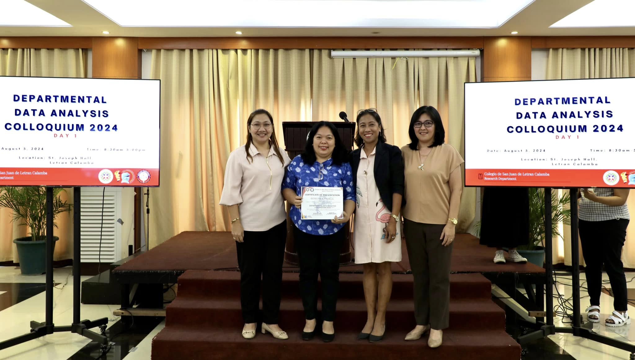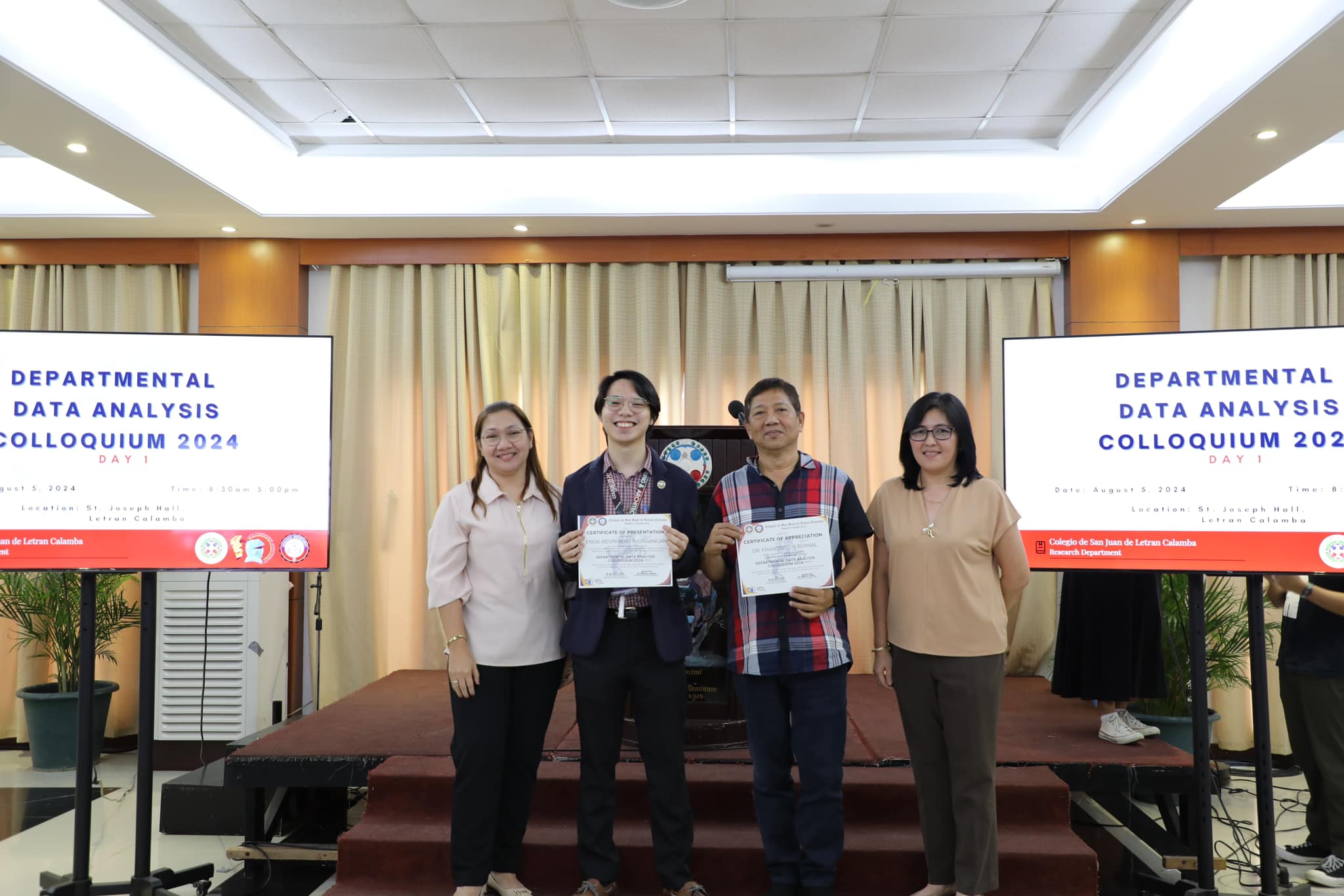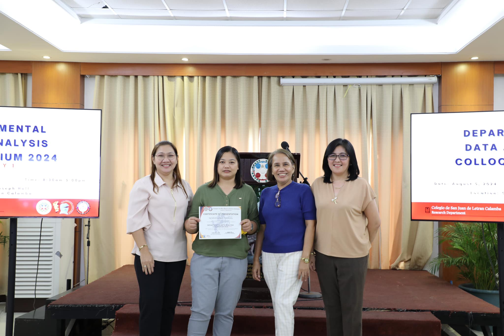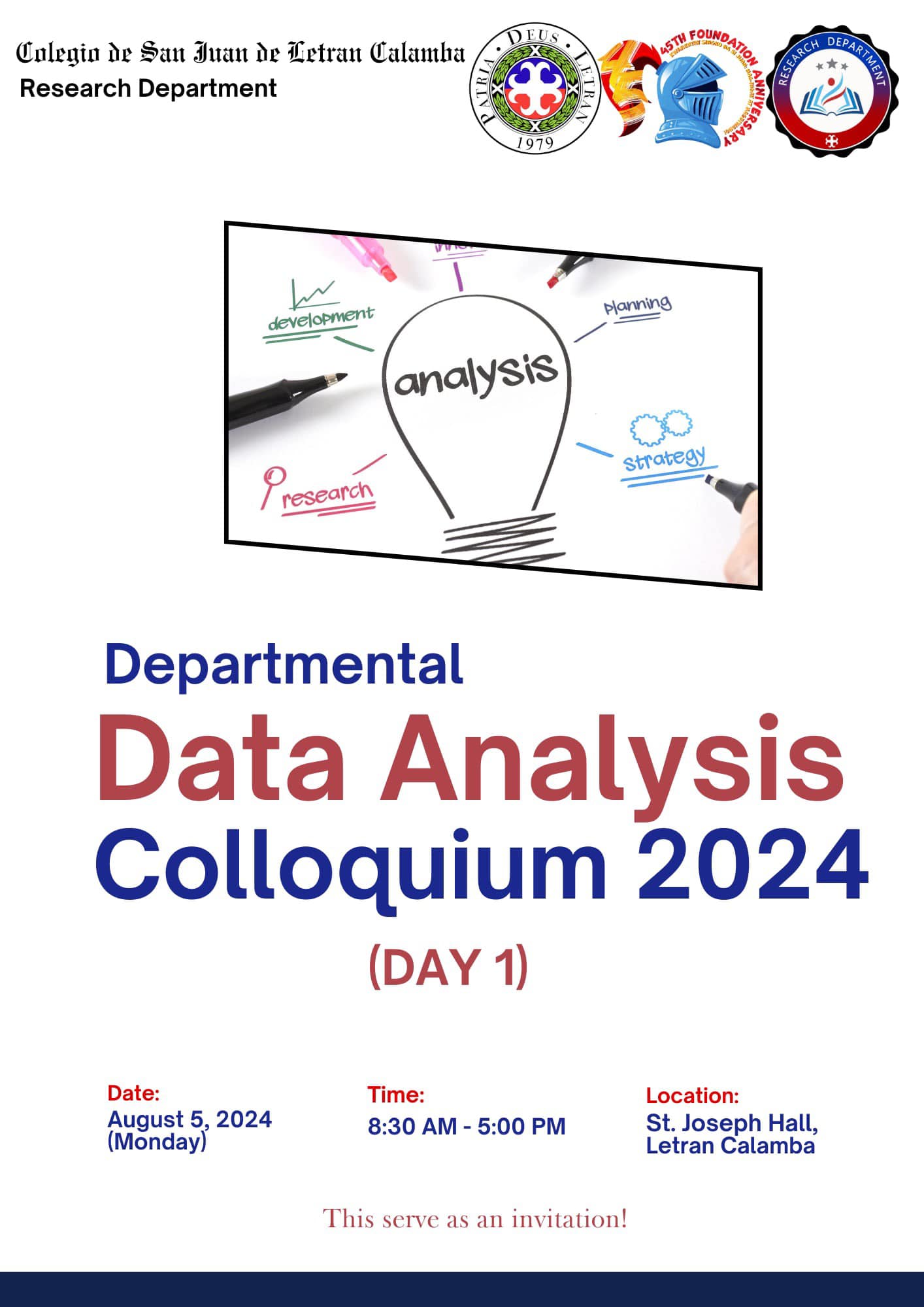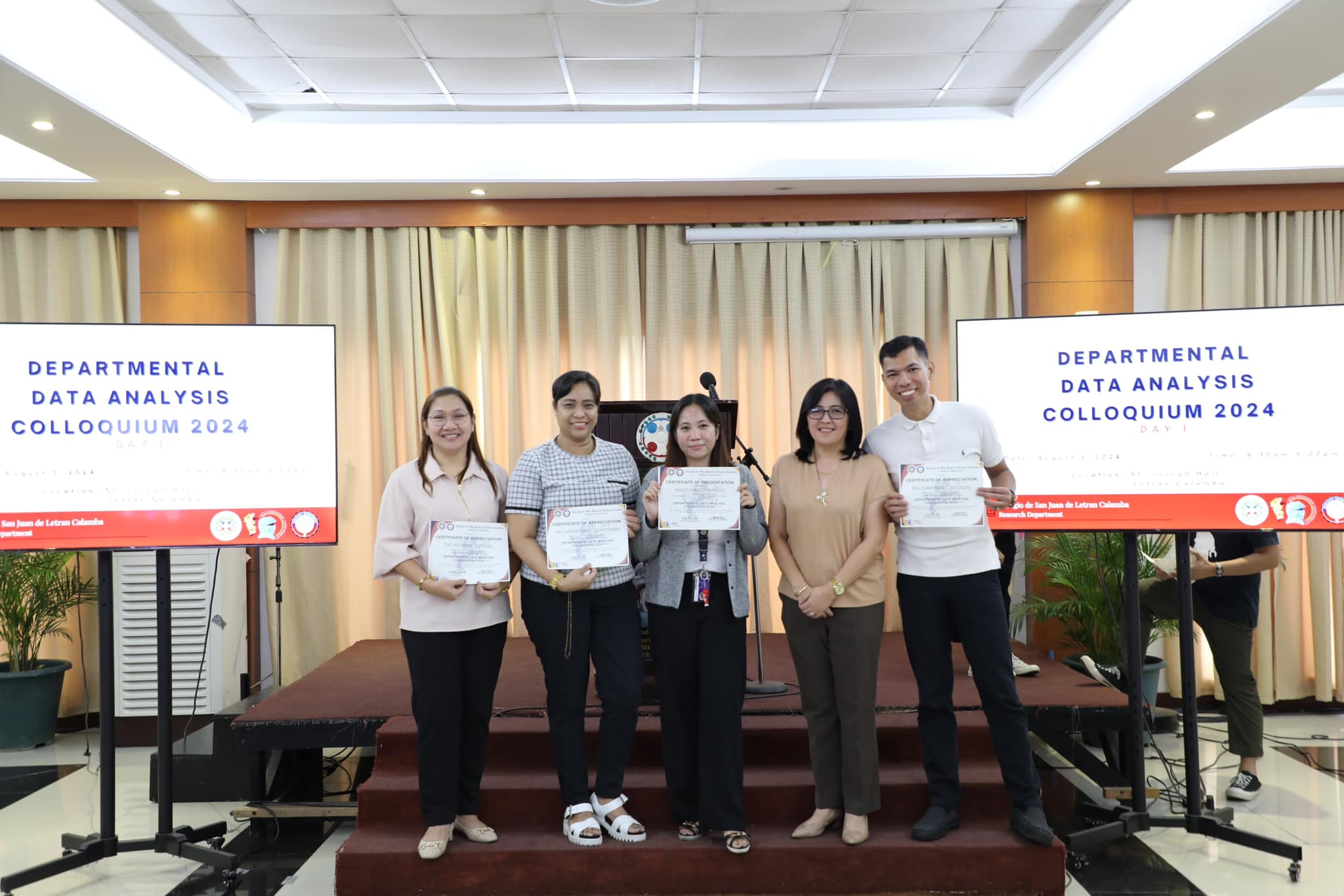 The Research Department (RD) of the Colegio de San Juan de Letran Calamba conducted the Data Analysis Colloquium 2024 (Part 1) last August 5, 2024, 8:30 am-5 pm at the St. Joseph Hall, Letran Calamba. This colloquium contributes insightful improvements based on their results and findings, discusses the latest trends, and explores innovative approaches to enhance Colegio's overall performance as an institution.