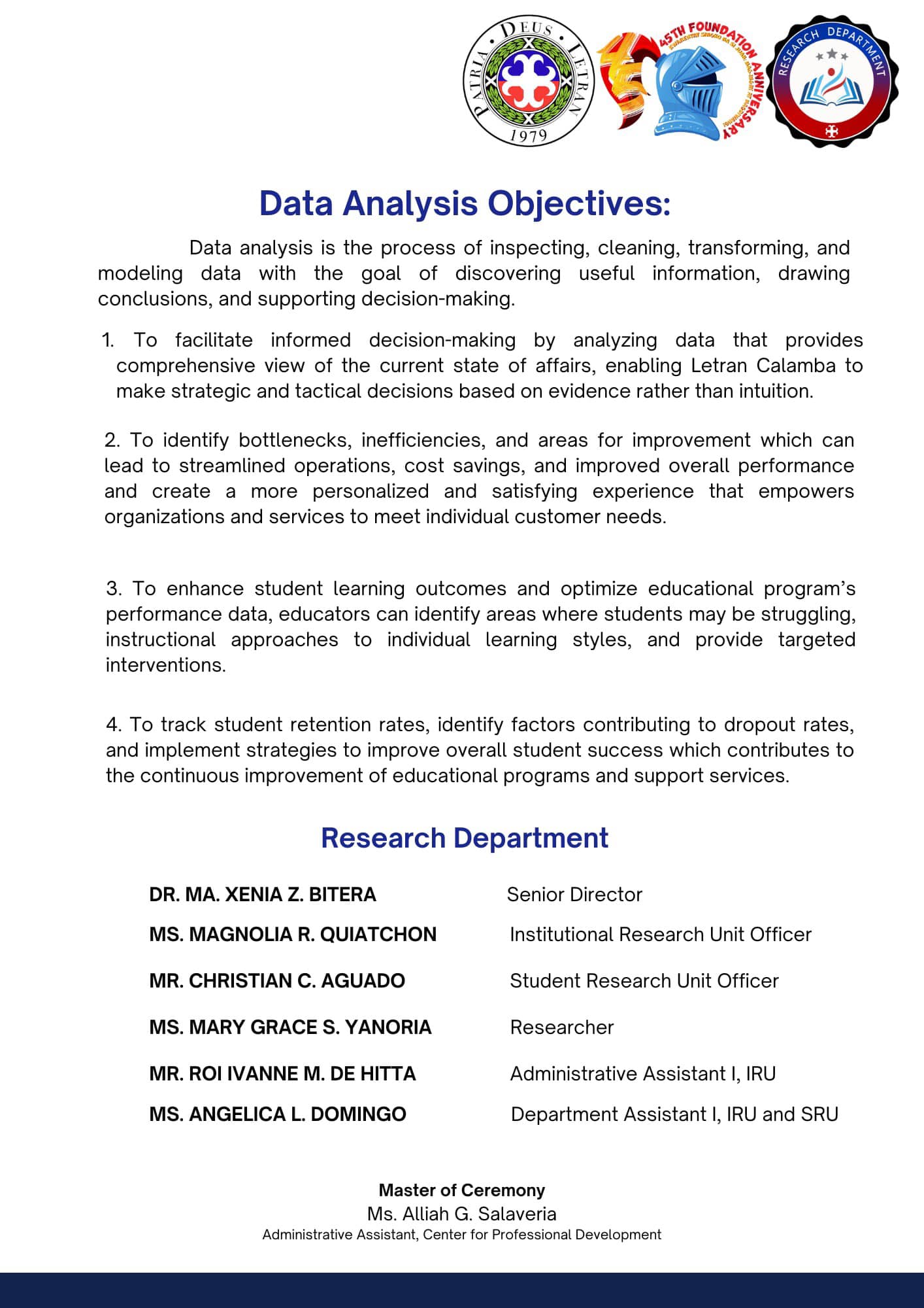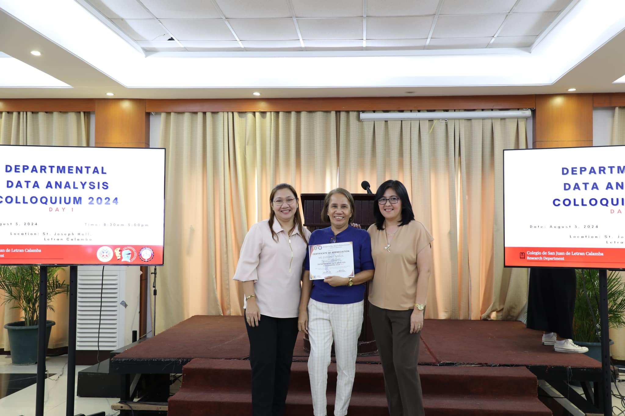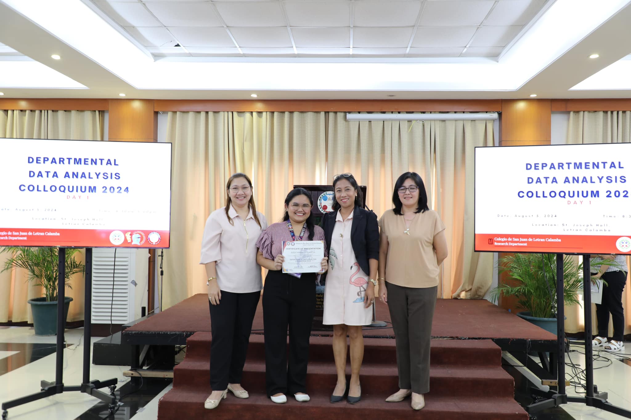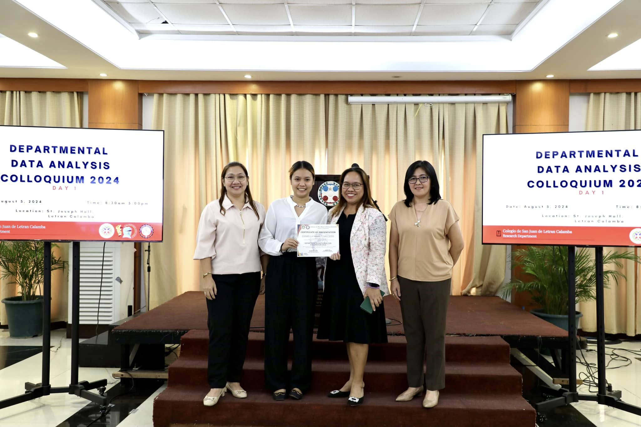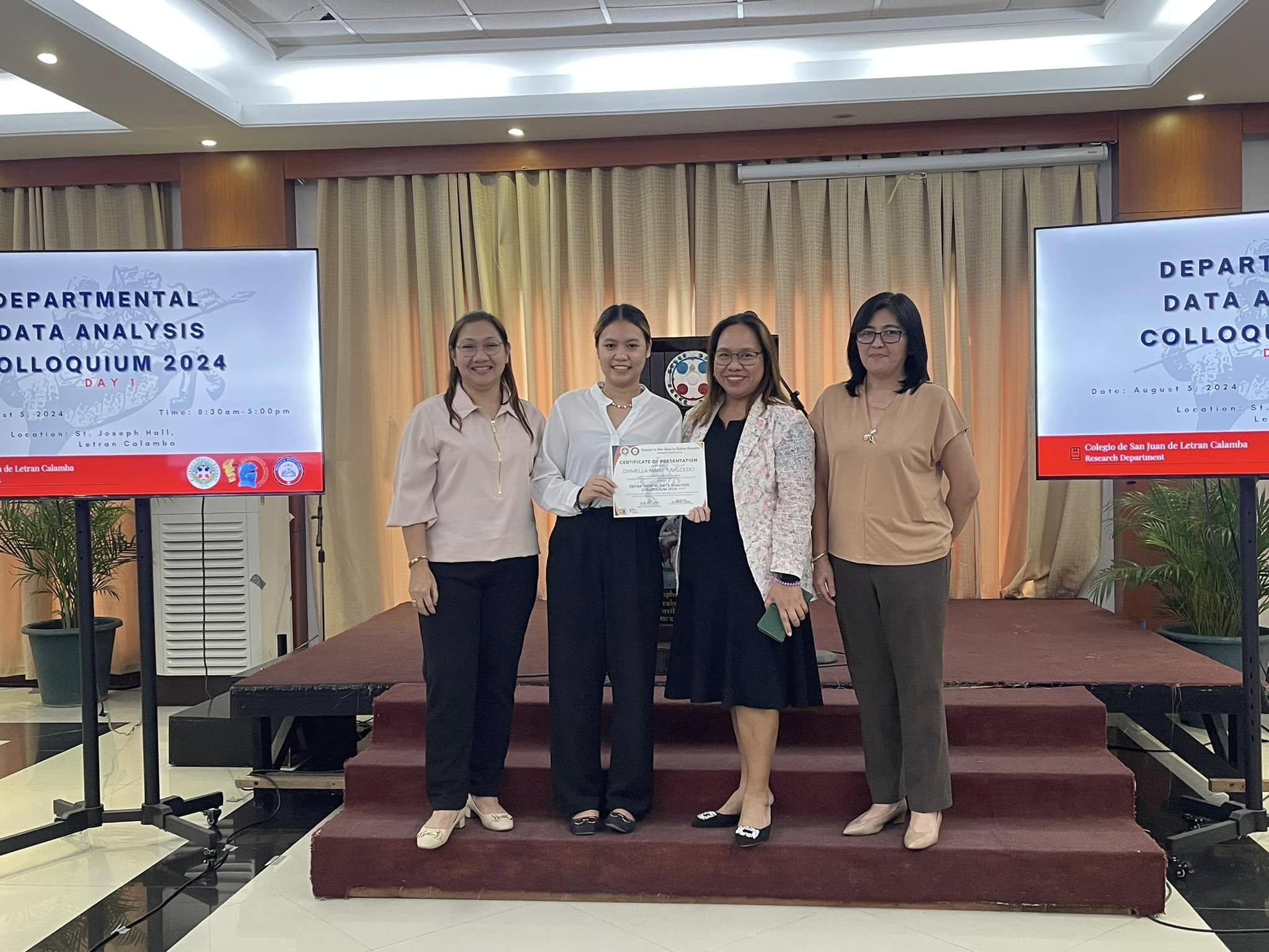 The Research Department (RD) of the Colegio de San Juan de Letran Calamba conducted the Data Analysis Colloquium 2024 (Part 1) last August 5, 2024, 8:30 am-5 pm at the St. Joseph Hall, Letran Calamba. This colloquium contributes insightful improvements based on their results and findings, discusses the latest trends, and explores innovative approaches to enhance Colegio's overall performance as an institution.