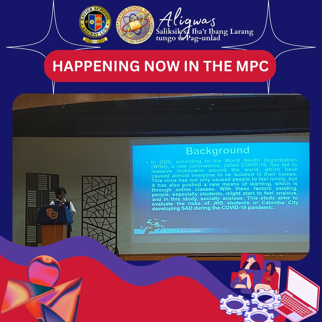 Letran Calamba joins the Xavier School Nuvali's Kongreso ng Pananaliksik 2023 - Aligwas: Saliksik sa Iba’t-ibang Larang tungo sa Pag-Unlad on February 24, 2023. All the best to our Senior High School student-researchers: Clark Benedict C. Lazo, Elyzza Marie DC. Dalmacia, Francis Neo DP. Esclamado, and Francesca Kesia V. Plantilla! They will present their research paper titled, "Risk of Junior High School Students in Calamba City to acquire Social Anxiety Disorder during the COVID-19 Pandemic."