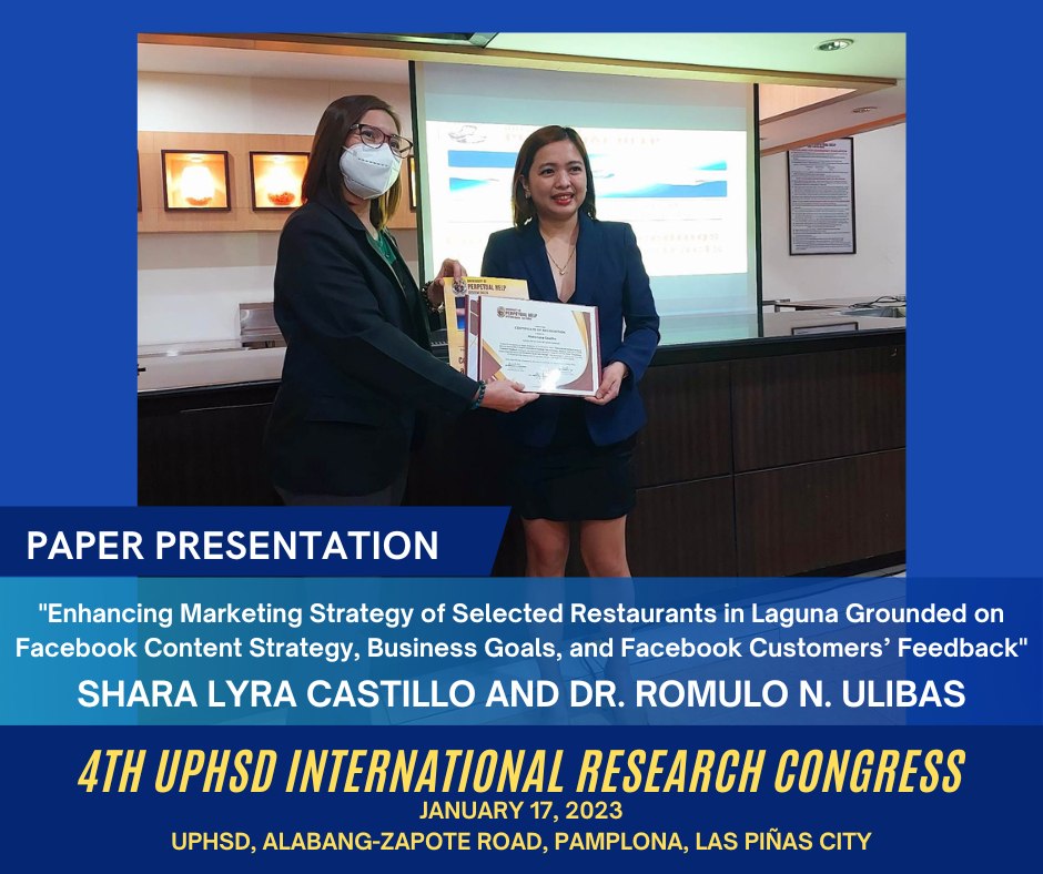 The RD would like to congratulate Ms. Shara Lyra Castillo and Dr. Romulo N. Ulibas of the Graduate School, for presenting their research paper titled, "Enhancing Marketing Strategy of Selected Restaurants in Laguna Grounded on Facebook Content Strategy, Business Goals, and Facebook Customers’ Feedback" in the 4th UPHSD International Research Congress, held in UPHSD, Las Piñas City on January 17, 2023.