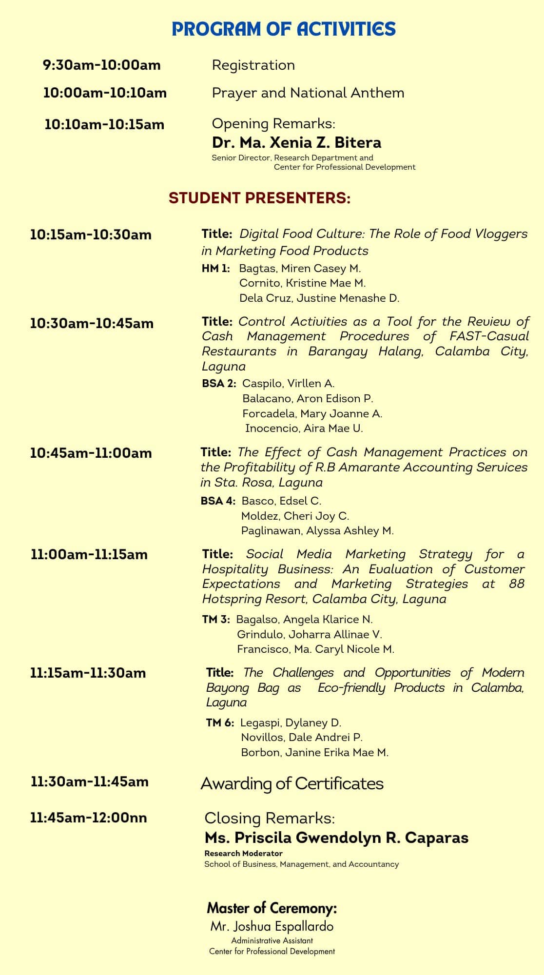 The selected students from the School of Business, Management, and Accountancy and School of Tourism and Hospitality Management presented their final research paper to their co-students to give knowledge and background on how a research paper/presentation be presented to everyone. The students will gain experience in presenting research findings in a professional settings and develop communication and public speaking skills.
